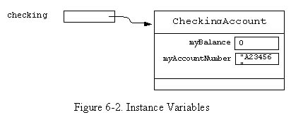 methods in your program can call them. 9. Once the method header has been specified, the implementation of the method must be supplied in a block that is delimited by braces {...}. The CheckingAccount methods will be implemented later in Section D. C. Instance Variables 1. Each object must store its current state. The state is the set of values that describe the object and that influence how an object reacts to method calls. In the case of our checking account objects, the state is the current balance and an account identifier. 2. Each object stores its state in one or more instance variables. Program 3-1