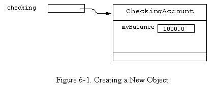3. To construct objects of the CheckingAccount class, it is necessary to declare an object variable CheckingAccount checking;Object variables such as checking are references to objects. Instead of holding an object itself, a reference variable holds the information necessary to find the object in memory. 4. This object variable checking does not refer to any object at all. An attempt to invoke a method on this variable would cause the compiler to generate an error indicating that the variable had not been initialized. To initialize the variable, it is necessary to create a new CheckingAccount object using the new operator checking = new CheckingAccount();This call creates a new object and returns a reference to the newly created object. To use an object, you must assign that reference to an object variable. 5. We will implement the CheckingAccount so that a newly created account has an initial balance of 1000.0 dollars. // open a new account double initialDeposit = 1000.0; CheckingAccount checking = new CheckingAccount(); // set initial balance to 1000.0 checking.processDeposit(intialDeposit);