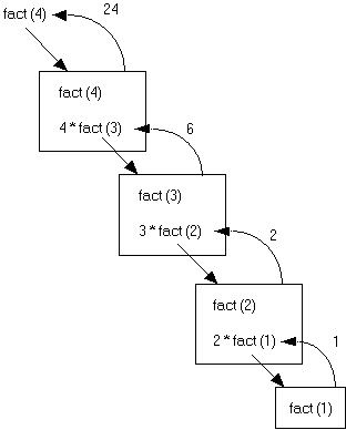 The factorial operation in mathematics is illustrated below. 1! = 1 2! = 2 * 1 or 2 * 1! 3! = 3 * 2 * 1 or 3 * 2! 4! = 4 * 3 * 2 *1 or 4 * 3! Notice that each successive line can be solved in terms of the previous
