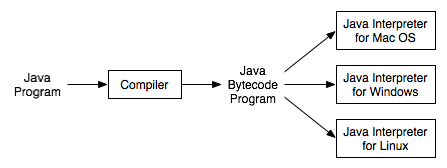 Of course, a different Java bytecode interpreter is needed for each type of computer, but once a computer has a Java bytecode interpreter, it can run any Java bytecode program. And the same Java bytecode program can be run on any computer that has such an interpreter. This is one of the essential features of Java: the same compiled program can be run on many different types of computers.