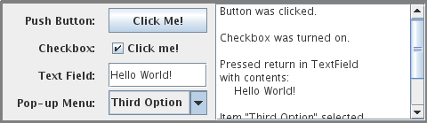 Below is a very simple Java program -- actually an "applet," since it is running right here in the middle of a Web page -- that shows a few standard GUI interface components. There are four components that the user can interact with: a button, a checkbox, a text field, and a pop-up menu. These components are labeled. There are a few other components in the applet. The labels themselves are components (even though you can't interact with them). The right half of the applet is a text area component, which can display multiple lines of text. And a scrollbar component appears alongside the text area when the number of lines of text becomes larger than will fit in the text area. And in fact, in Java terminology, the whole applet is itself considered to be a "component." Try clicking on the button and on the checkbox, and try selecting an item from the pop-up menu. You will see a message in the text area about each action that you perform. You can type in the text field, but you might have to click on it first to activate it. When you press return while typing in the text field, you will see a message in the text area: