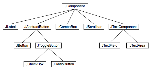 The use of the term "message" here is deliberate. Messages, as you saw in the previous section, are sent to objects. In fact, Java GUI components are implemented as objects. Java includes many predefined classes that represent various types of GUI components. Some of these classes are subclasses of others. Here is a diagram showing some of Swing's GUI classes and their relationships: