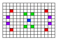 The four red squares in the picture, for example, form a set of such symmetrically placed squares, as do the purple squares and the green squares. (The blue square is at the center of the mosaic, so reflecting it doesn't produce any other squares; it's its own reflection.)